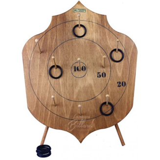 Descripció: Llençant les fitxes amb la goma elàstica cal intentar apropar-se tant com es pugui al centre de la diana per tal de fer el màxim de punts possibles. Mides: Aprox. 122*41cm.