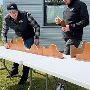 Descripció: Sandàlies o esquís gegants. Joc originari d’Indonèsia. Versió infantil. Format per dues fustes de 1.5m. Tres persones amb els peus fixats a les fustes s’han de coordinar i posar d’acord per avançar conjuntament. Llargada: 1,20 m.