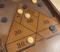 Descripció: Joc de taula d’habilitat on cal aconseguir la màxima puntuació possible tirant les fitxes des d’una distància de 3-4 metres. Segons on caigui la fitxa s’obtindran més o menys punts. Mida: Tauler de 101*51cm.